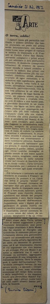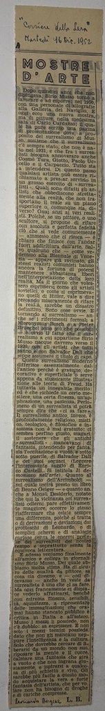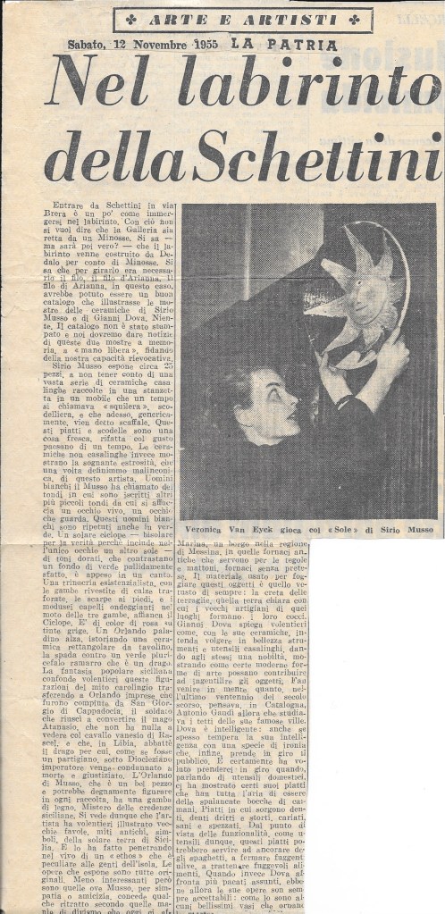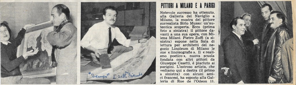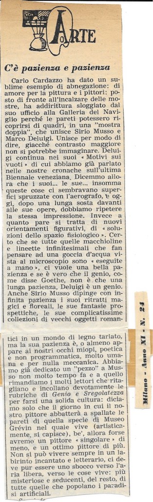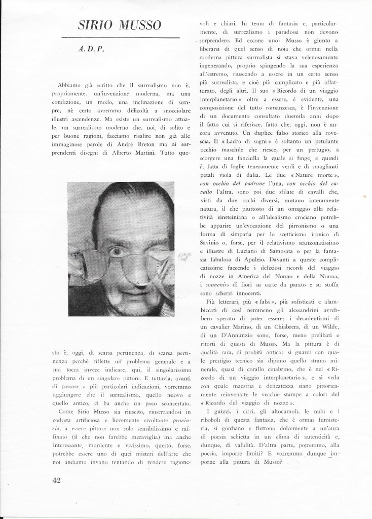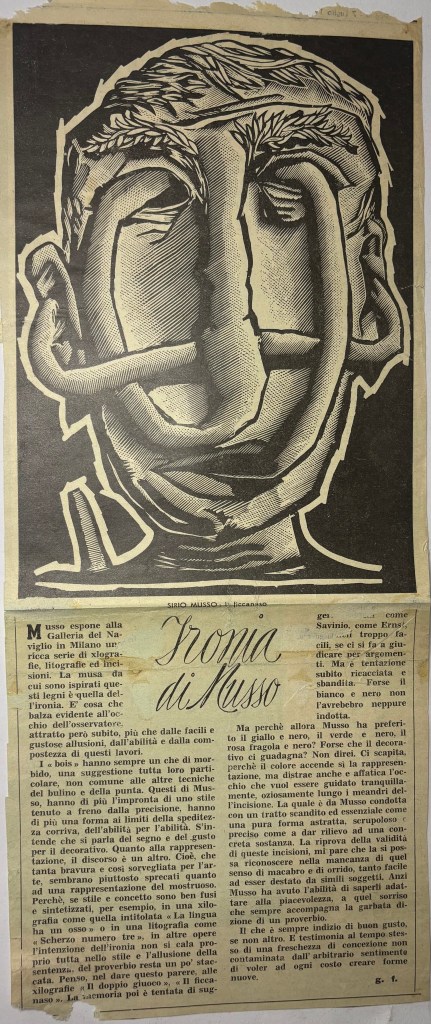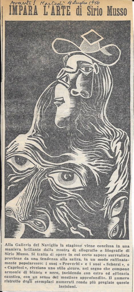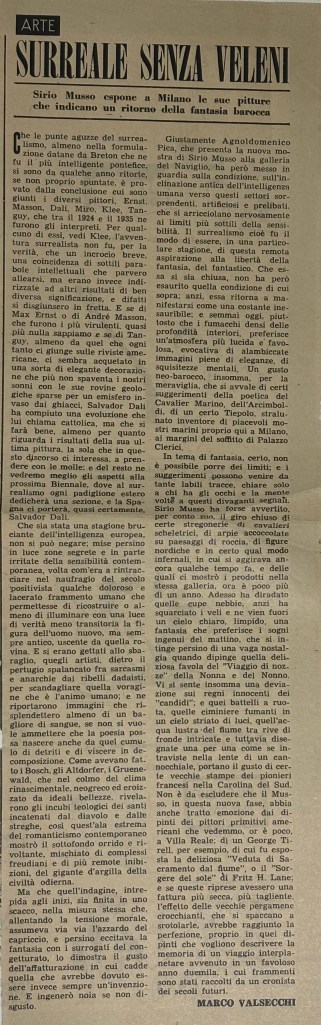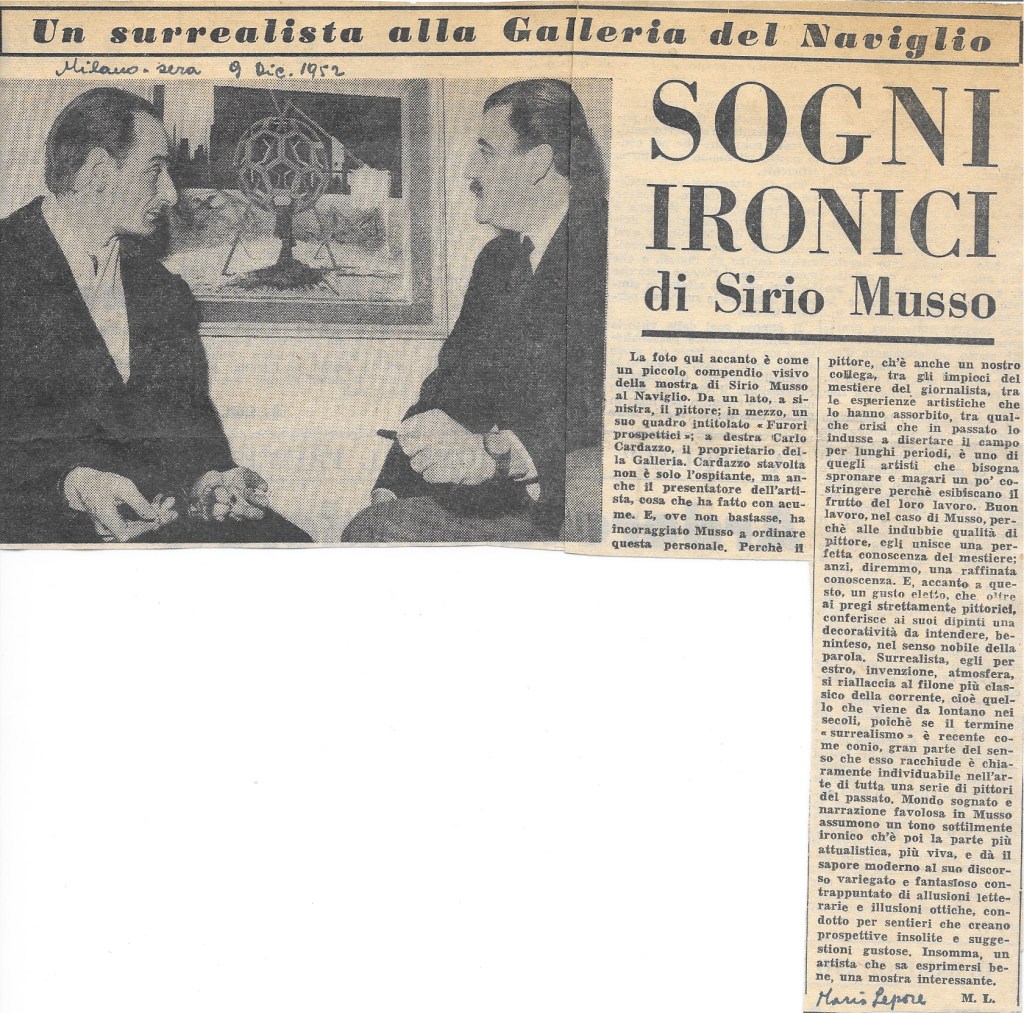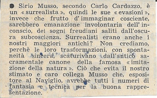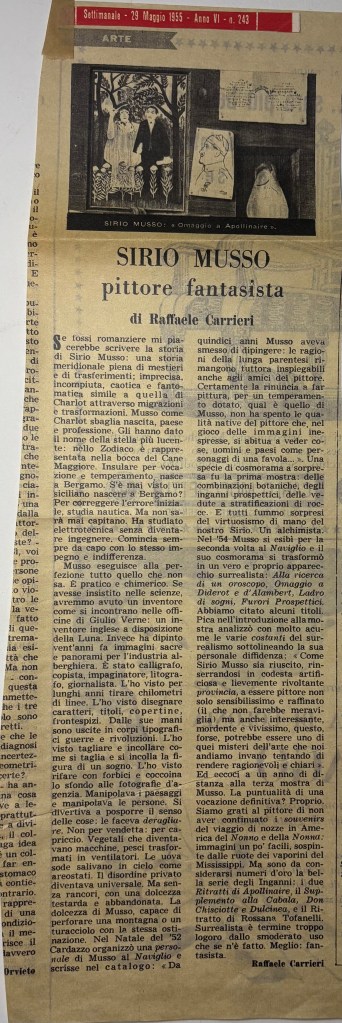 Questa sezione raccoglie una selezione di articoli, recensioni e approfondimenti pubblicati sulla stampa nazionale e locale tra gli anni ’50 e ’60, che testimoniano il percorso artistico e umano di Sirio Musso. Attraverso questi ritagli, emerge il ritratto di un artista originale e visionario, capace di coniugare fantasia e tecnica, realtà e immaginazione, e di attirare l’attenzione di critici e giornalisti dell’epoca. Le cronache raccontano mostre personali e collettive, incontri con figure di rilievo della cultura italiana e internazionale, nonché l’evoluzione di uno stile sempre in dialogo con il surrealismo e il simbolismo, ma profondamente personale.
