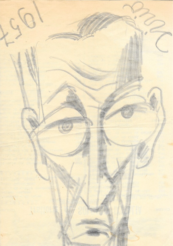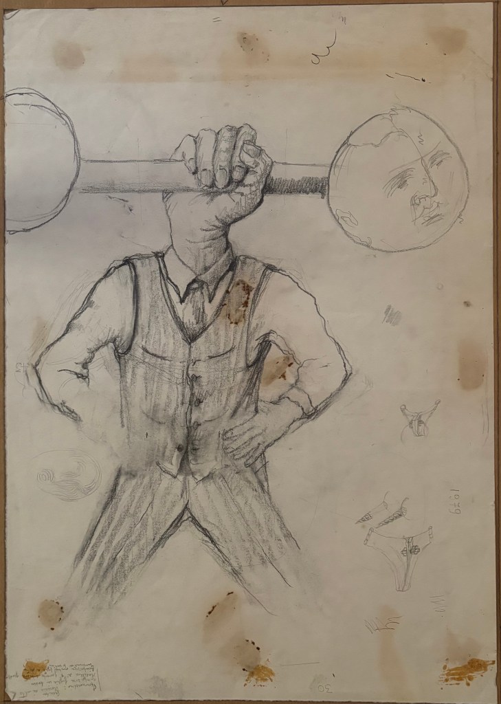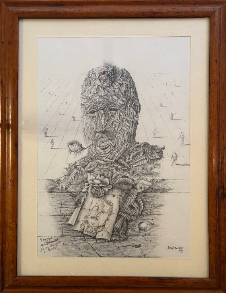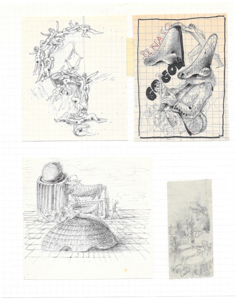 Seguono una serie di opere grafiche che spaziano dal surrealismo alla rappresentazione simbolica, passando per studi anatomici, caricature e appunti visivi. Schizzi su fogli sparsi, taccuini, carte riciclate: tutto diventa supporto per un’idea, un’emozione, una visione.