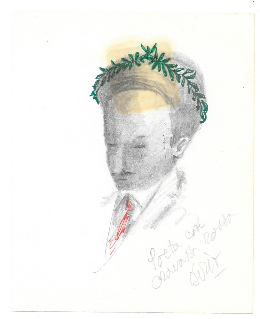 piccolo ritratto di profilo con occhi chiusi, alloro verde e cravatta rossa; tono lieve, poetico.