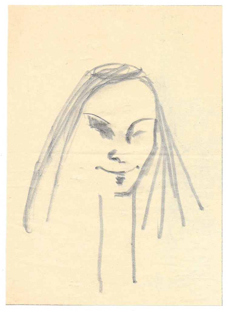 Volto femminile con sorriso accennato, costruito con pochissime linee sciolte.