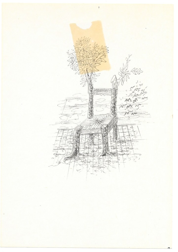 Sedia sul pavimento a riquadri, gambe e spalliera trasformate in rami; in alto un nastro di nastro adesivo antico.