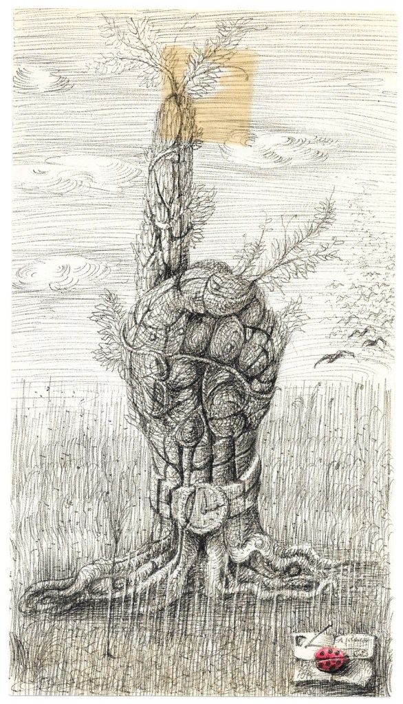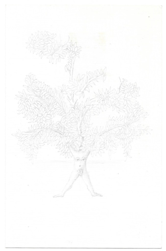 Un corpo umano, gambe divaricate e volto nel tronco, si trasforma in chioma rigogliosa; il segno è tenue e quasi trasparente.