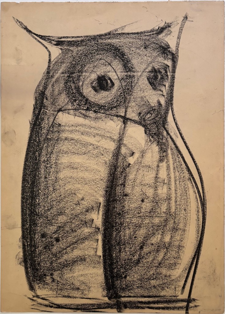 Grande gufo stilizzato, occhi tondi magnetici e corpo massiccio definito da campiture sfregate. Linee tese delineano orecchi e profilo.