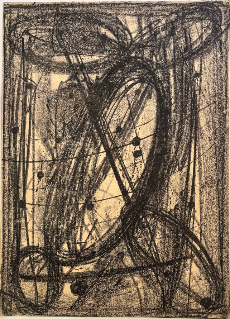 Campo pieno di traiettorie circolari, diagonali e schizzi puntiformi; i passaggi di grafite vanno dal velo leggero al nero profondo.